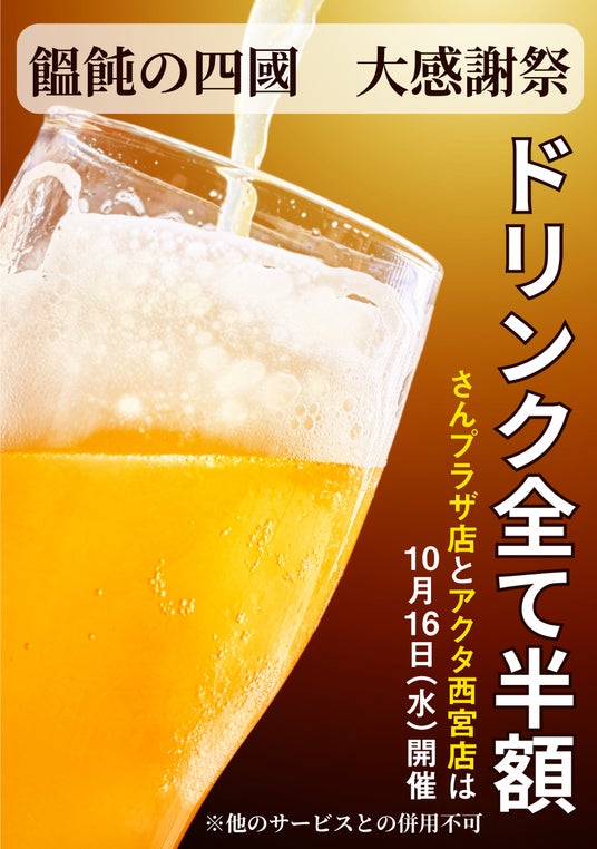 1966年、うどんの本場・香川県丸亀市で「うどん」専門店を開業し、うどんのトップブランドと称されてきました「讃岐うどん」の美味しさを世に広めてきた「饂飩の四國」。現在は居酒屋風の業態も取り入れ、「うどん居酒屋」としても親しまれています。その、さんプラザ店とアクタ西宮店では日頃のお客様への感謝の気持ちをこめて月に一度の大感謝祭を10月は16日(水)に開催。ドリンクメニュー半額のサービスを実施させていただきます。生ビール、各種サワー、そしてソフトドリンク、どれも半額でございます。(食事メニューの注文は必須でございます)「うどん」に加え、「天ぷら」、「揚げ物」、「サラダ」などの食事メニューと共にお楽しみください。皆さまのご利用をスタッフ一同お待ちしております。