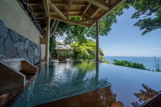 静かな海沿いの港町、北川(ほっかわ)温泉の高台から、海に昇る朝日と満月が描く光の道「ムーンロード」を望む、全室オーシャンビューの大人の隠れ家リゾート。露天風呂からは、空と海の青が溶けあうような絶景をご覧いただけます。