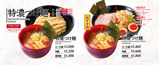 時間をかけてじっくりと炊き込むことにより、豚骨と魚介の旨味を極限までに引き出した「濃厚豚骨魚介スープ」。スープとの相性を最大限引き出すため小麦粉の配合にこだわり、香り・コシ共に妥協を許さない極太麺。[並・中・大]の3サイズが同一料金。お腹いっぱい召し上がっていただけます。