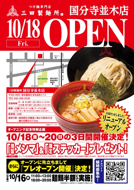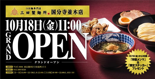 三田製麺所店のオープンを祝して、10月18日(金)のオープンから3日間限定で「特製メンマ」と「オリジナルステッカー」をプレゼントさせていただきます。国分寺・小平エリアの皆様はもちろんのこと、お近くをお立ち寄りのお客様方のご来店心よりお待ち申し上げております。