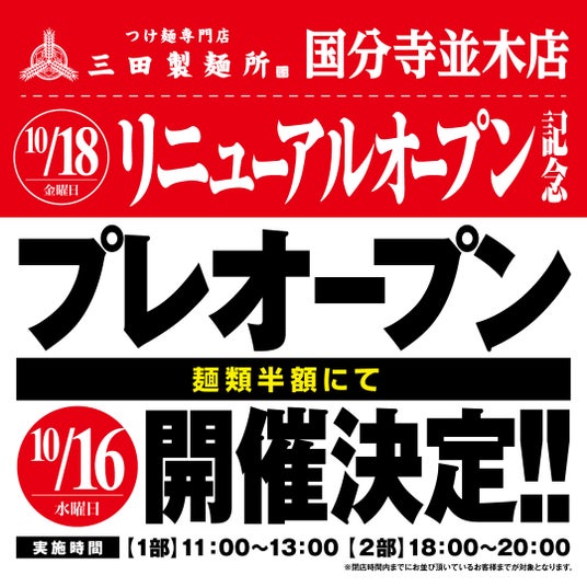 株式会社エムピーキッチン(本社:東京都渋谷区、代表取締役:村上竹彦)が運営する)『三田製麺所 国分寺並木店』が、2024年10月18日(金)にリニューアルオープン!!