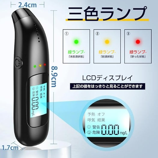 暗い場所でもしっかりと確認できるLCDディスプレイを搭載しており、アルコール濃度に応じて異なるランプが点灯します。