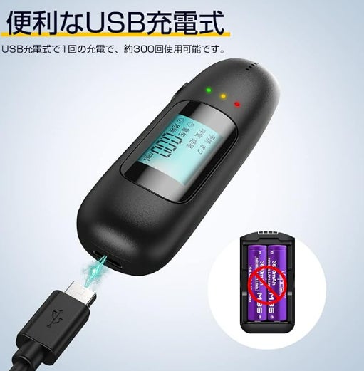 USB充電式のため、繰り返し使用できてエコロジーかつ経済的です。1時間のフル充電で約300回の測定が可能です。充電には付属のUSBケーブルを使用し、モバイルバッテリーや車載充電器などに接続するだけで手軽に充電できます。