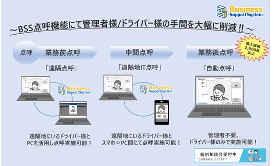 弊社は、運送会社様の日常業務を少しでも楽に簡単に実施していただくためBSS点呼システムを