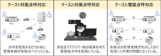 点呼を実施するだけの目的で各拠点へいち管理者様が訪問していたため、時間と手間がかなりかかっていた。