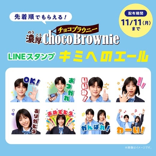 CM放映を記念し、ブルボンのオリジナルデザインの高橋さんと當真さんのLINEスタンプ濃厚チョコブラウニー「キミへのエール」(全8種)を期間限定・数量限定で無料配信します。ブルボンLINE公式アカウントと友だちになると先着順でもらえます。応援したい人とのトークにぜひお使いください。LINEアプリ内のスタンプショップ「ホーム」タブ内、「あなたへのおすすめ無料スタンプ」セクションから入手いただけます。