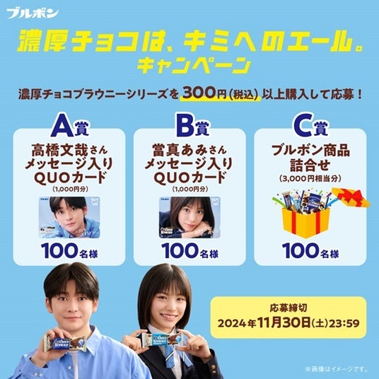 また、新CMの放送を記念して、キャンペーンを実施します。「濃厚チョコは、キミへのエール。キャンペーン」は、10月15日(火)~11月30日(土)の期間中、対象商品となっている濃厚チョコブラウニーシリーズの商品を合計300円(税込)以上ご購入いただくとご応募いただいた方の中から抽選で、高橋文哉さんメッセージ入りQUOカードが100名様、當真あみさんメッセージ入りQUOカードが100名様、ブルボン商品詰合せが100名様に当たるキャンペーンを実施します。