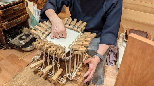 (C) 藤井楽器. 三味線の皮張り作業風景