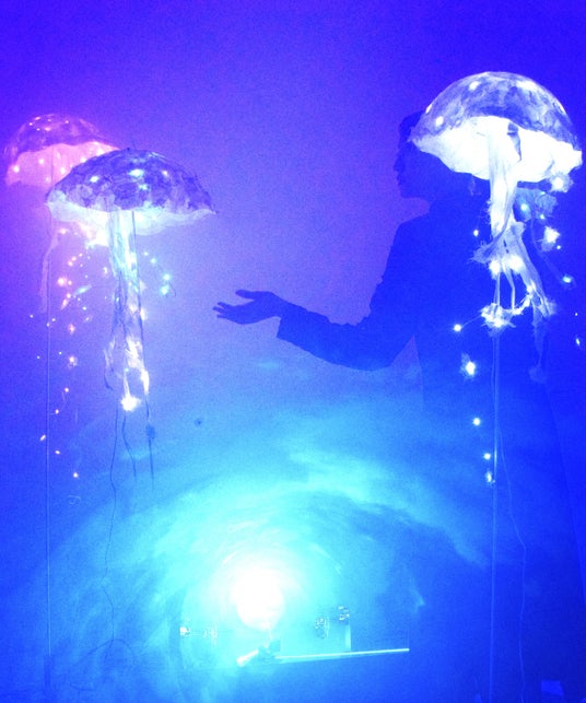 ミストが漂うラボ・体験工房に、複数の白色樹木枝や光るクラゲが浮かび、朝露に煙る森や豊かな海の景観が現れ、人々を光の幻想世界へ誘います。