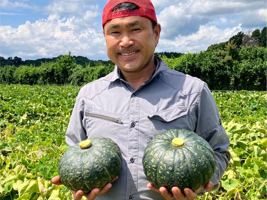 田中農園は、スイカ栽培が有名な函南町で長くスイカ農家を営んできました。40年ほど前にスイカ畑の空いたスペースを使ってカボチャ栽培をスタート。スイカ栽培のノウハウを取り入れて栽培するカボチャは糖度が高く、とてもおいしいカボチャに育ちます。日当たりが良く肥沃な畑で、有機堆肥と最低限の消毒で育てられています。