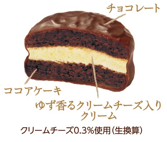 ◆高知県産ゆずの果汁とクリームチーズパウダー(※1)を使用したクリームを、ココアケーキでサンドしチョココーティングした小さなチョコパイです。