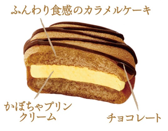 ◆クリームにはかぼちゃ(※2)、生クリーム(※3)を使用し、カラメルソースを練り込んだ生地でサンドしたふんわりプチケーキです。
