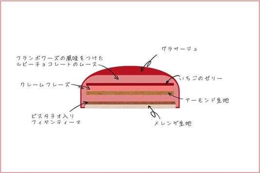 フランボワーズとルビーチョコレートを合わせた真っ赤なムースでコーティングされた、クリスマスらしい華やかなケーキです。中には、いちごのゼリーとピスタチオ入りのフィヤンティーヌを入れ、濃厚ながらも食べやすい味わいに仕上げました。
