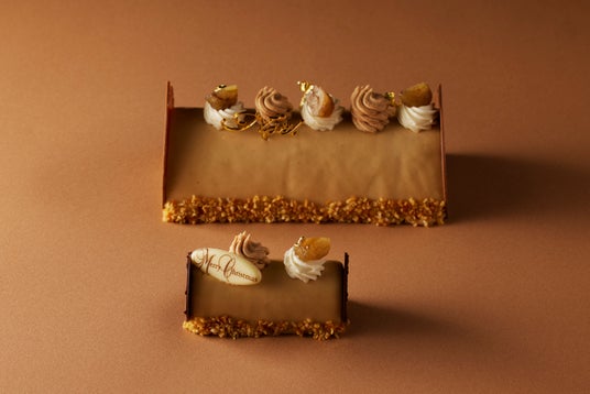 濃厚なチョコレートムースをまとった、甘みとほろ苦さがハーモニーを奏でるチョコレートベースのケーキです。カカオと相性の良いオレンジとゆずのゼリーを入れたほか、キャラメリゼしたヘーゼルナッツやシュトロイゼルでサクサクとした食感を加えました。