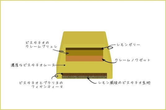 レモン風味のピスタチオ生地を土台に、ピスタチオムースやピスタチオのクレームブリュレ、レモンゼリー、ヘーゼルナッツクリームを合わせた爽やかなケーキです。
