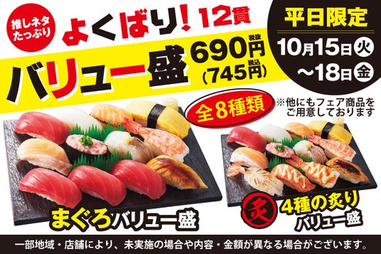 人気ネタが勢ぞろい!フェアでしか味わえない、炙りネタなども入ってバリエーション豊富な全8種類!平日特別価格『12貫690円(税込745円)』でご提供します!!