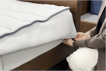 今回提供したベッドマットレスは、3分割されたブロックをボックスシーツ型のカバーで固定するパリ2024大会での知見を活かしたモデルです。復元性が高く、肩の部分を柔らかくすることで、よりスムーズな寝返りをサポートします。ホテルでは一般にマットレスを長持ちさせるために定期的に裏表を入れ替えて使用することが多く、大きな1枚のマットレスを動かすことは作業者には負担となっています。エアウィーヴのマットレスは3つのブロックに分割されているため、作業時の負担を軽減します。 また、カバーは従来モデルに比べ着脱が容易なため、お手入れやベッドメイキングがスムーズにできます。カバーはもちろん、中材のエアファイバー(R)も水洗いが可能なため、常に清潔な睡眠環境を保てます。