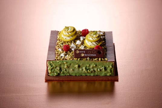 バニラチョコレートのサブレの上に、ヘーゼルナッツがアクセントのピスタチオビスキュイ、栗入りのピスタチオブリュレ、チョコレートビスキュイ、ラズベリージャム、塩キャラメルチョコレートムースを丁寧に重ねました。トップにはツリーに見立てたピスタチオクリームを飾り、たっぷりと散りばめたシュガーコーティングピスタチオが食感のアクセントに。香ばしく濃厚な風味のピスタチオとほろ苦いチョコレート、ラズベリーの酸味が織りなすハーモニーをお楽しみください。
