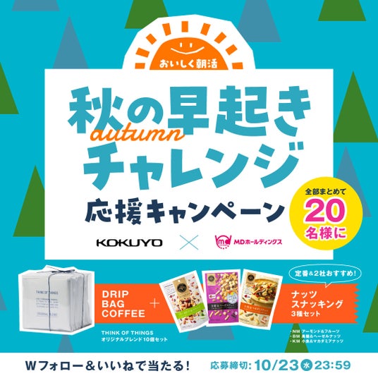 コクヨとMDホールディングスのコラボレーションを記念し、両社の公式Instagramアカウント(@kokuyo_official)(@mdhdg2215)で、プレゼントキャンペーンを実施いたします。下記方法によりご応募頂いた方の中から、コクヨの「THINK OF THINGSオリジナルブレンド」が10個セットになった商品と、MDホールディングスの「ナッツスナッキング」シリーズ3種のセットを、抽選で合計20名様にプレゼントいたします。朝食や間食にピッタリのコーヒーと、健康応援おやつをぜひお試しください。