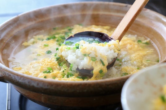 鍋の〆は濃厚な出汁を味わう雑炊 ご飯に鍋の出汁を染み込ませ、最後に卵を絡ませます