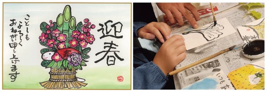 左:タオル筆で描く年賀状 完成イメージ、右:ワークショップイメージ