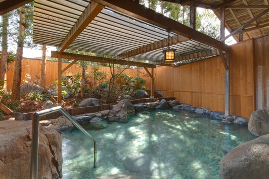 併設の大露天風呂は緑豊かな和の庭にあり、あふれるほどの湯と湯けむりとあいまって、