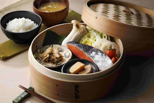 (蒸し鮭、季節野菜の温野菜、炊きたてご飯、お味噌汁)