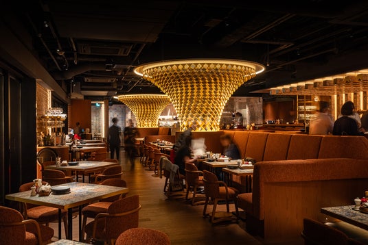 無数のスペインタイルが揺れる柱が印象的なメインダイニング。夜の時間はインテリアの美しさが際立ちます。