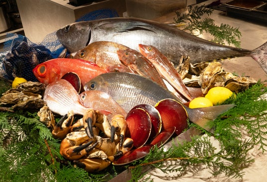 生け簀横のアイスベッドにも新鮮な魚介が並びます。