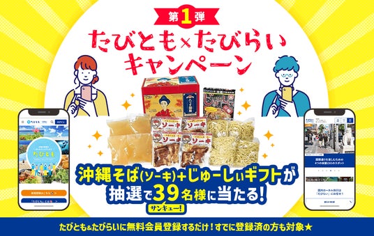 「たびとも×たびらいキャンペーン第1弾」は、2024年10月11日(金)~11月8日(金)までの期間中に、「たびらい」と「たびとも」の2サイトに無料会員登録をしていただいた方の中から抽選で39名様に、「沖縄そば(ソーキ)+じゅーしぃギフト」をプレゼントします。