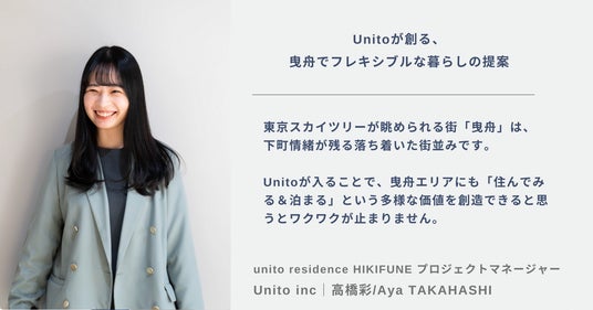 株式会社Unito(本社:東京都千代田区、代表取締役:近藤 佑太朗、以下Unito、読み:ユニット)は、旭化成不動産レジデンス株式会社(本社:東京都千代田区、代表取締役社長:高橋 謙治、以下旭化成不動産レジデンス)が開発した賃貸マンション「へーベルメゾン曳舟」の一部を賃借し、Unito独自の家賃システム 「帰らない日は家賃がかからないリレント」を導入し、運営を開始します。