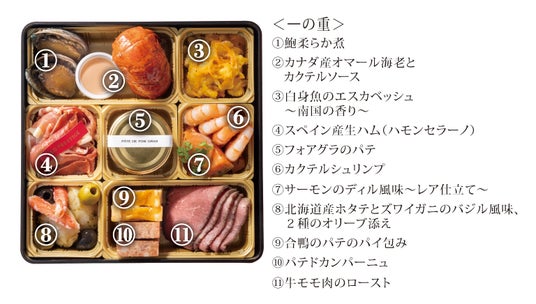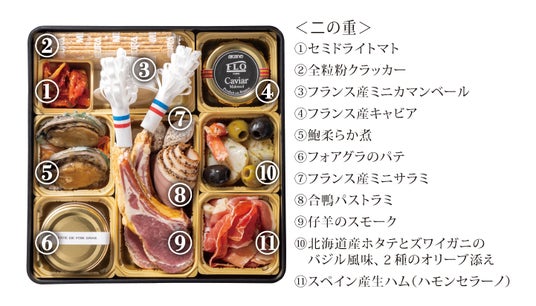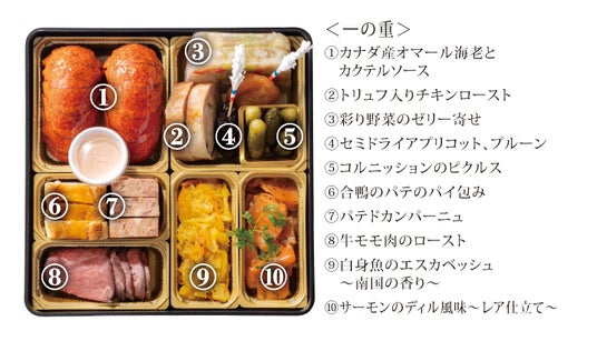 今年もキャビアやフォアグラ、オマール海老、鮑や仔羊などの豪華食材を取り揃え、新年のお祝いに相応しく、華やかで味わい豊かな“フレンチおせち”に仕上げました。