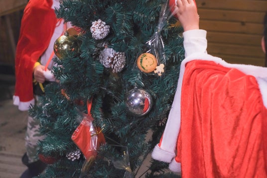 クッキーにイラストを描いてクリスマスツリーに装飾する子供たち