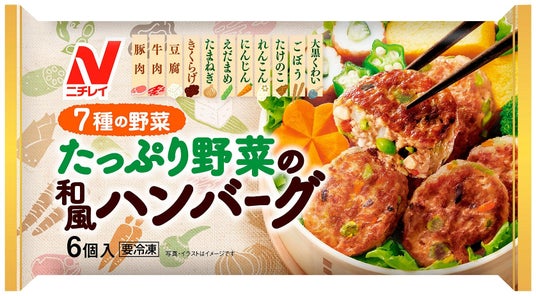 たっぷり野菜と豆腐を使った、ヘルシー感のある和風ハンバーグです。7種類の野菜(大黒くわい、ごぼう、たけのこ、れんこん、にんじん、えだまめ、たまねぎ)を使用。大黒くわいとたけのこの食感がアクセントです。