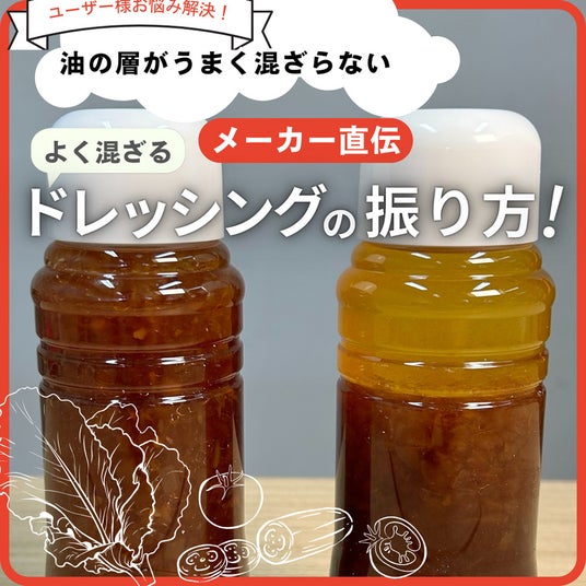 分離液状ドレッシング(油と調味液の層が分かれているドレッシング)を振ってもうまく混ざらなかった経験はありませんか?と問いかけ、タテ・ヨコ2種類の振り方を動画で比較。タテ振りでは時間が経つとすぐに分離してしまうのに対して、ヨコ振りはすぐに混ざり合い、同じ時間が経過しても混ざり合った状態を維持することから、次にドレッシングを使うときはぜひ“ヨコ振り”で!と、ご紹介しました。