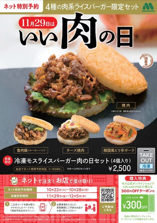 今回は、11月29日の“いい肉の日”に向けた企画として、お肉を使用した4種類の冷凍ライスバーガー(焼肉、チーズ焼肉、韓国風ピリ辛ポーク、魯肉飯(ルーローハン))がセットになったスペシャルアソートを、モスのネット注文限定で予約販売します。モスのネット注文の「特別予約注文」から注文していただき、商品はモスバーガー店舗で受け取りとなります。
