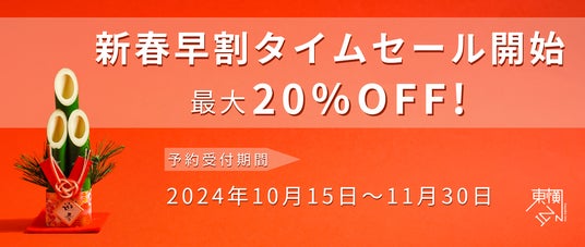 株式会社東横イン(本社:東京都大田区)は、公式予約サイト限定でお早めのご予約により、お得にご宿泊いただける「新春早割タイムセール」を実施中です。客室料金が期間限定、室数限定で最大20%OFFになる大変お得なセールです。客室料金が高くなりがちなお正月の帰省やご旅行、また、のんびりホテルステイ等に、是非ご利用ください。
