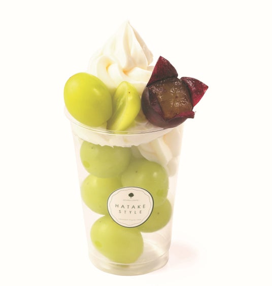 1983年創業。山形県上山市の有機肥料にこだわったフルーツ狩り体験が人気の果樹園。旬のシャインマスカットとピオーネに、山形県産牛乳を使ったソフトクリームをあわせたパフェです。