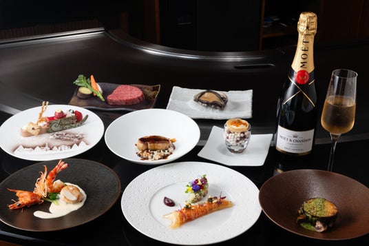 フレンチテイストで仕上げたオマール海老の前菜から始まり、フォアグラと黒トリュフの香り高いリゾット、活鮑のプランチャ、極上牛ステーキを堪能する豪華ディナーをご堪能いただけます。