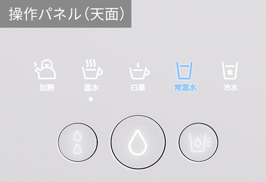 操作パネルは天面に配置することで、存在感を排除するとともにお子さまによる誤作動防止等にも配慮しています。また、操作パネルには「nendo」がデザインしたアイコンを採用。温水、冷水、加熱、常温水、白湯(※1)の5つの温度帯と通常出水、連続出水(約1Lを上限に自動出水)、定量出水(約200ml自動出水)の3つの出水モードを直観的に選ぶことができ、お子さまからお年寄りの方まで簡単に操作することができます。
