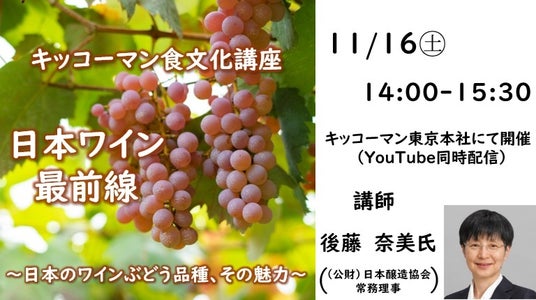 キッコーマン国際食文化研究センター(*)は、11月16日(土)14:00から、キッコーマン東京本社KCCホールにおいて、「日本ワイン最前線」~日本のワインぶどう品種、その魅力~をテーマにした食文化講座を開催します。26名様限定で、会場でご参加いただけるほか、YouTubeライブ配信でも無料でご視聴いただけます。なお、会場でご参加の方には、ワインの試飲をご用意しています。