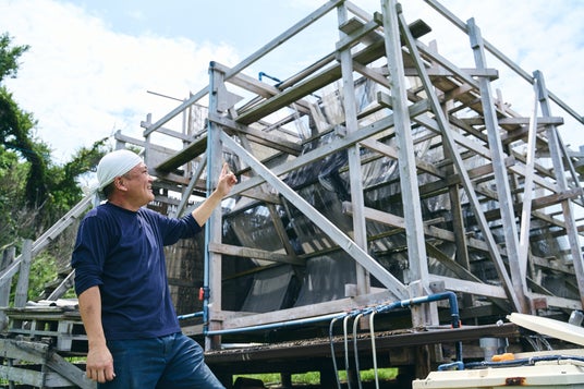 海水から水分を蒸発させる流下装置を説明する末澤さん