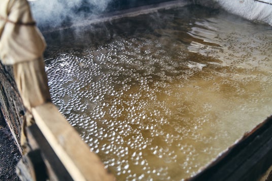 工程を理解した後は、塩づくりにチャレンジ。始めに、薪で炊き上げられている鉄釜にスコップを入れ、底に沈んでいる塩をすくい上げます。塩から湯気が立ちキラキラと輝く様子や、大きな結晶があるとピラミッドのような形を確認できることは、製造過程に立ち会うからこその体験です。すくい上げた後は、温かい塩を袋に入れ、水分が多い状態のままご自宅に持ち帰っていただきます。この時点での塩は水気を多く含み、通常の塩よりも苦汁(にがり)が多く、少し濃度の高い状態です。このままでも使用できますが、ご自宅に戻ってから少しの間ざるにのせ、苦汁をゆっくりと落としていくことにより、味がまろやかに変化していきます。ご自身がおいしいと感じるタイミングで、ざるから上げて完成です。