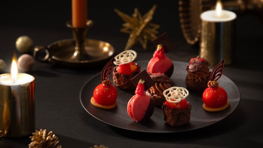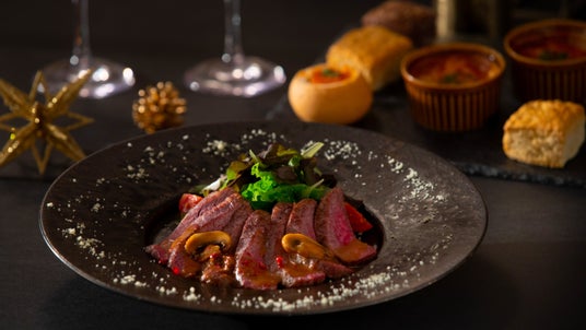 いちごピューレにライム果汁を合わせる爽やかなアミューズから始まり、クリスマスオーナメントをイメージした艶めくストロベリームースやショコラクリームの濃厚な味わいが楽しめるシューショコラ、またセイボリーでは、香り高いポルチーニと野菜たっぷりのラタトゥイユを詰めたプティブレッドやシグネチャーのラザーニアなどをご用意し、さまざまな味わいで最後まで飽きずにご堪能いただけます。さらに期間限定で「国産牛ロース」のプレートが付いたプレミアムなコースもご提供いたします。
