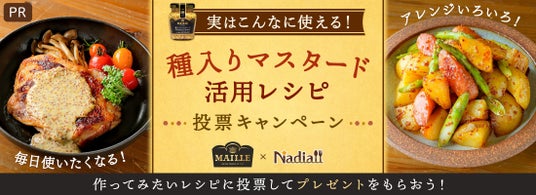 今回の「種入りマスタード活用レシピ投票キャンペーン」は、Nadia Artistから自由応募の形で種入りマスタードを活用したレシピを投稿いただき、Nadiaユーザーに対して作ってみたいレシピに投票していただくレシピ投票キャンペーンです。