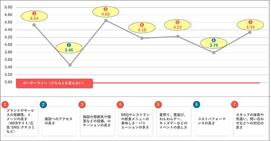 加えて、創業当時から注力している体験価値を高めるコンテンツ開発(イベントやアクティビティ)については、推奨者・中立者・批判者ともに概ね満足度が高い結果となりました。プールでの水遊び、花火などのお子様が安心して楽しく遊べる空間やサービスの提供、お子様から大人まで幅広い世代が参加できるリクエスト型のDJイベントの支持も目立ちました。