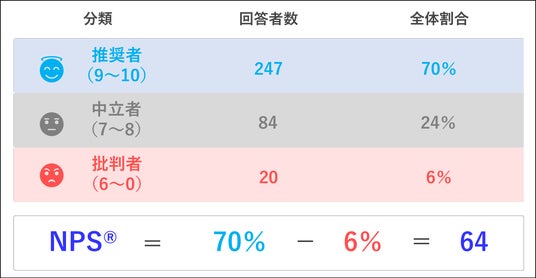 ・推奨者が70%、批判者が6%で、NPS(R)は+64という評価結果