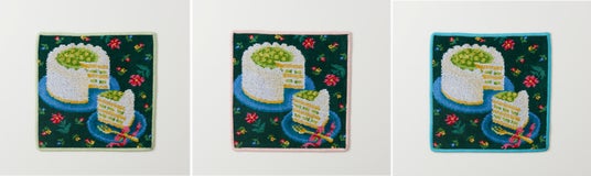 ハンカチの縁どりカラーは全3色で、いちごにぴったりの「ピンク」、なじみの良い「アイボリー」、差し色となる「ターコイズブルー」がラインアップ。