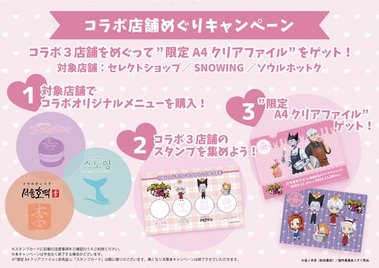 期間中、コラボオリジナルメニューをご購入いただいたお客様にスタンプカードを進呈いたします。 各店舗でコラボオリジナルメニューを購入して全てのスタンプを集めていただいたお客様に「限定A4クリアファイル(全1種)」(非売品・数量限定)をプレゼントいたします。