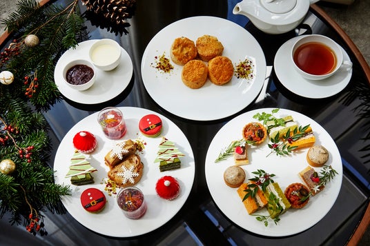 スイーツは、サンタクロースをモチーフにしたマカロンやストロベリーピーチムース、ツリーを模った緑茶のオペラなど、クリスマスオーナメントを想わせる鮮やかな6種類が揃うほか、ローストチキン & クリームチーズのサンドイッチ、トリュフとリコッタのキッシュなど、この時期ならではの5種類のご馳走が並ぶセイボリーのプレートにはハーブをあしらいクリスマスリースに見立てました。さらにスコーンはプレーンのほか、黒トリュフとヘーゼルナッツが登場します。Lobby Barのフォトジェニックなアフタヌーンティーで、心躍るホリデーシーズンをご満喫ください。